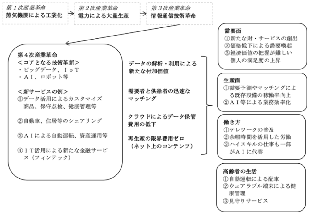 第4次産業革命の進展は、生産、販売、消費といった経済活動に加え、健康、医療、公共サービス等の幅広い分野や、人々の働き方、ライフスタイルにも影響を与える